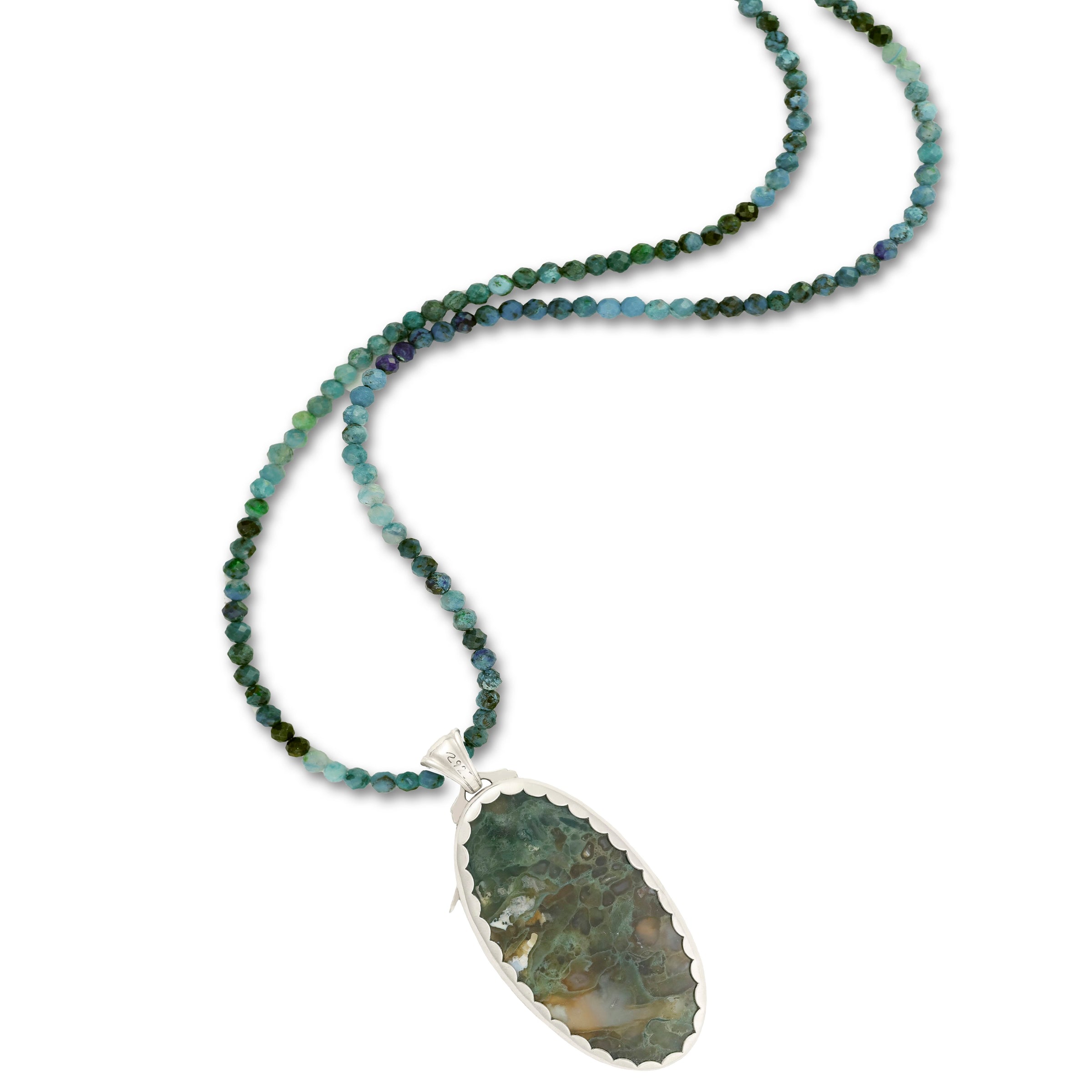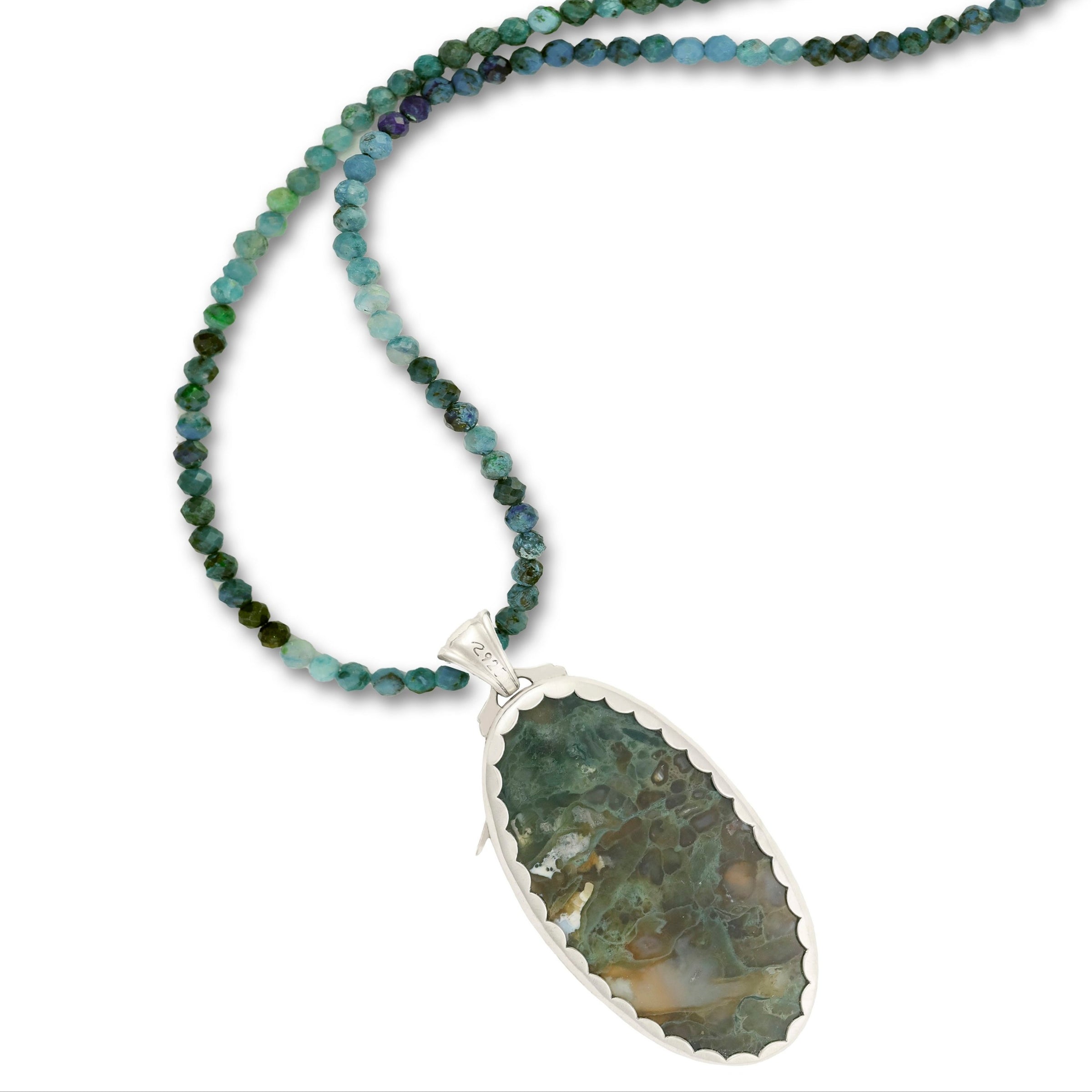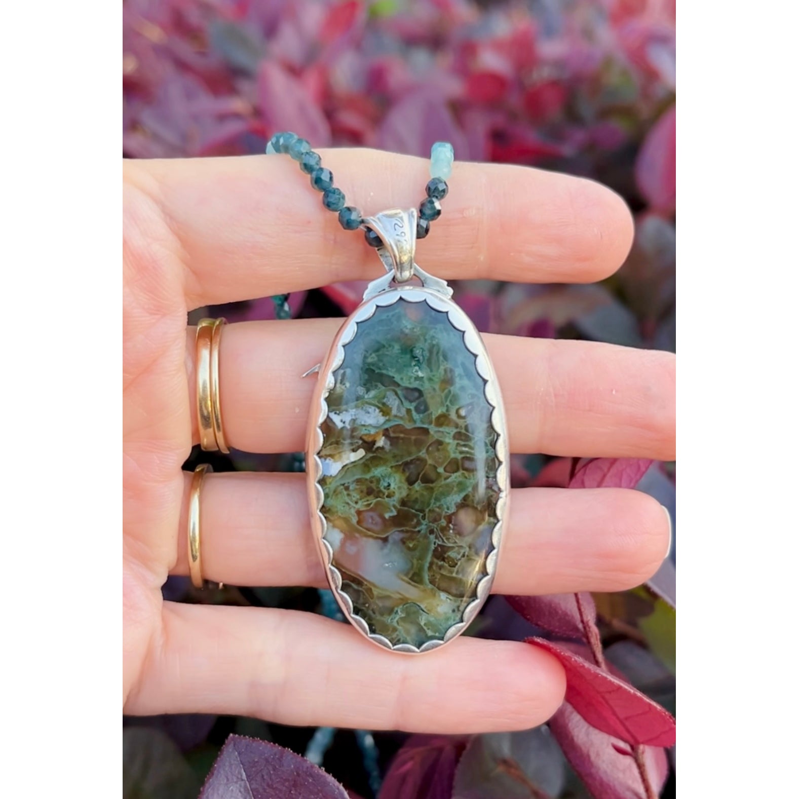 Made to order by artist Kelly Morgen from 18k gold, sterling silver, moss agate stone & moss agate beading.