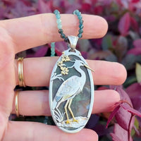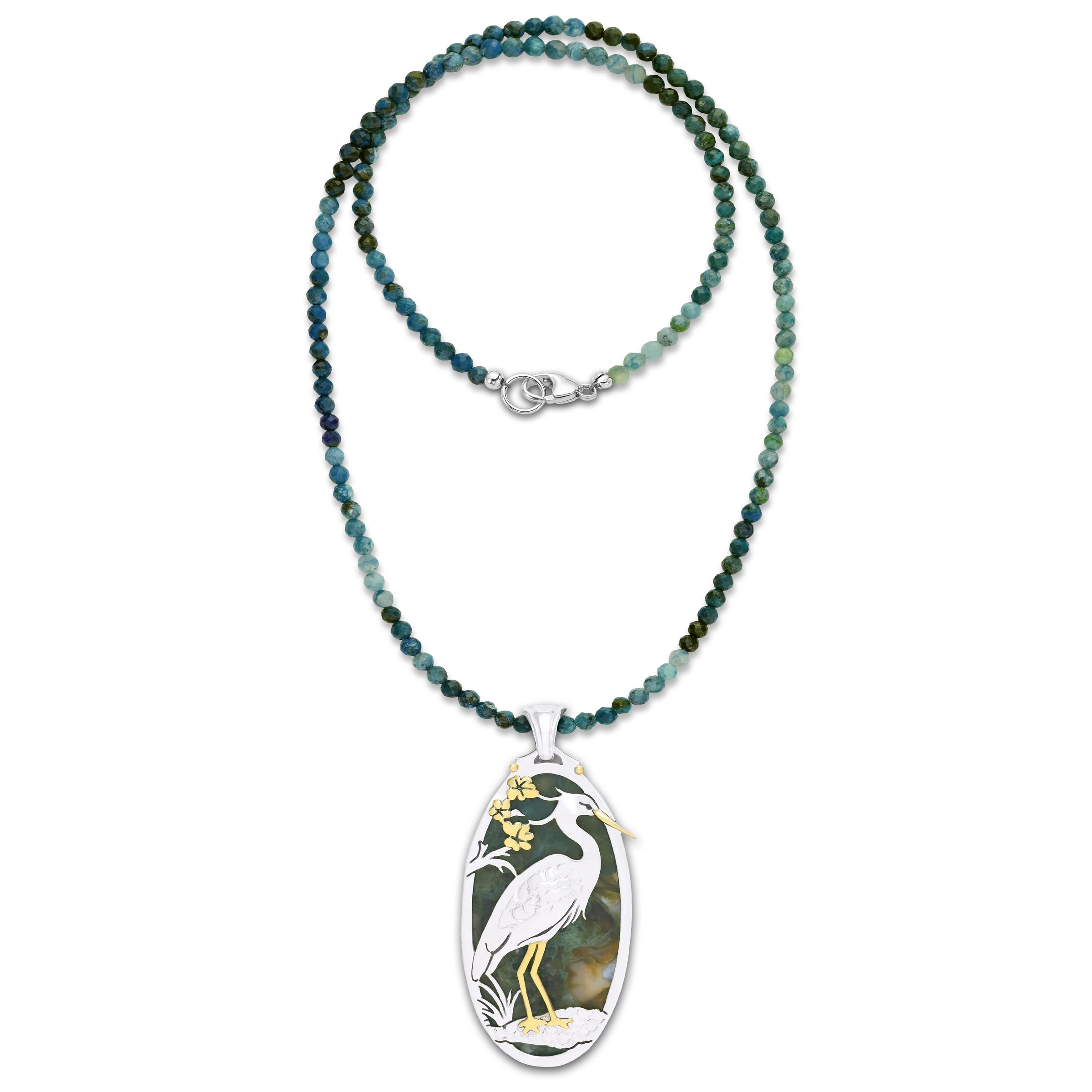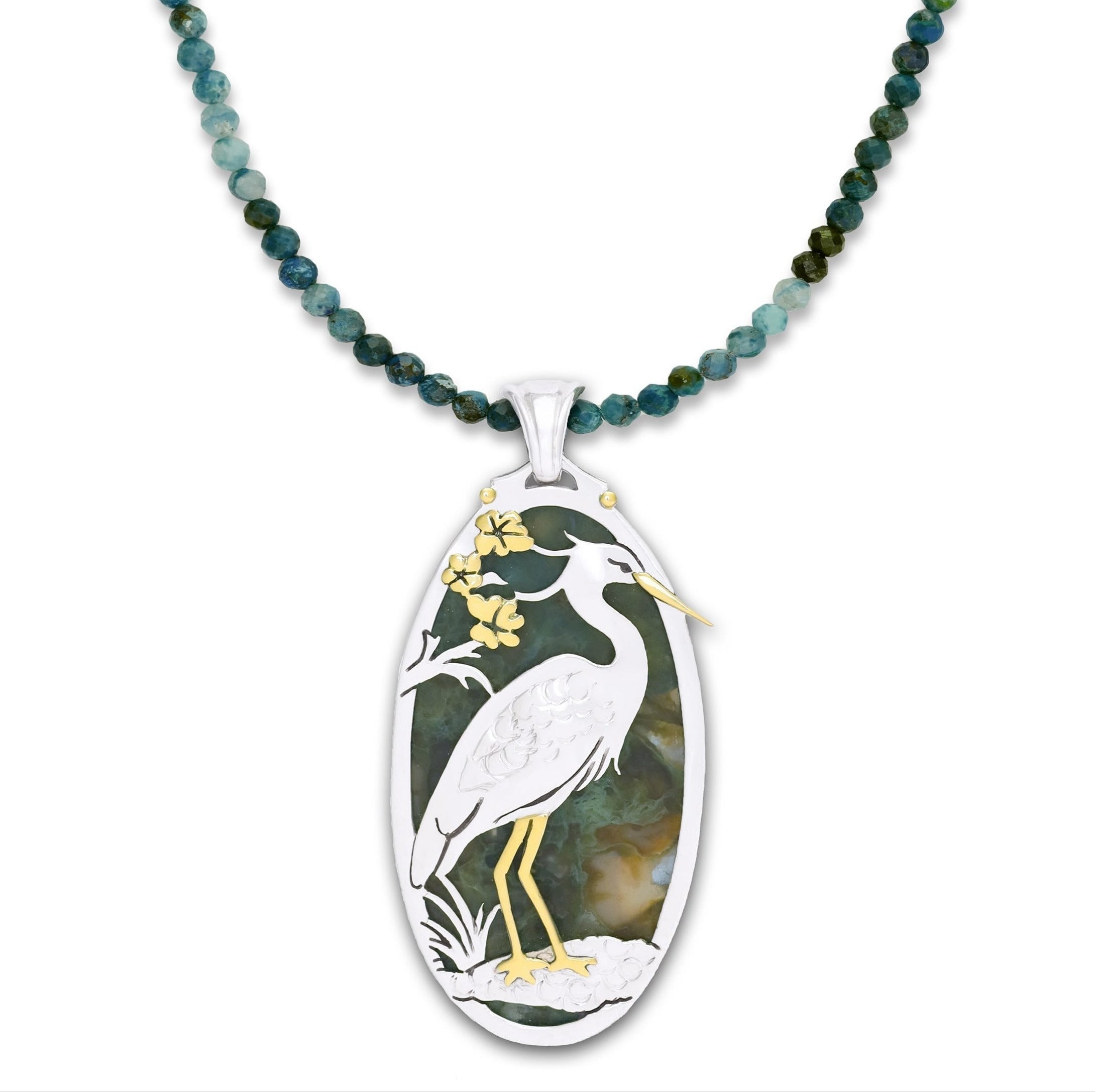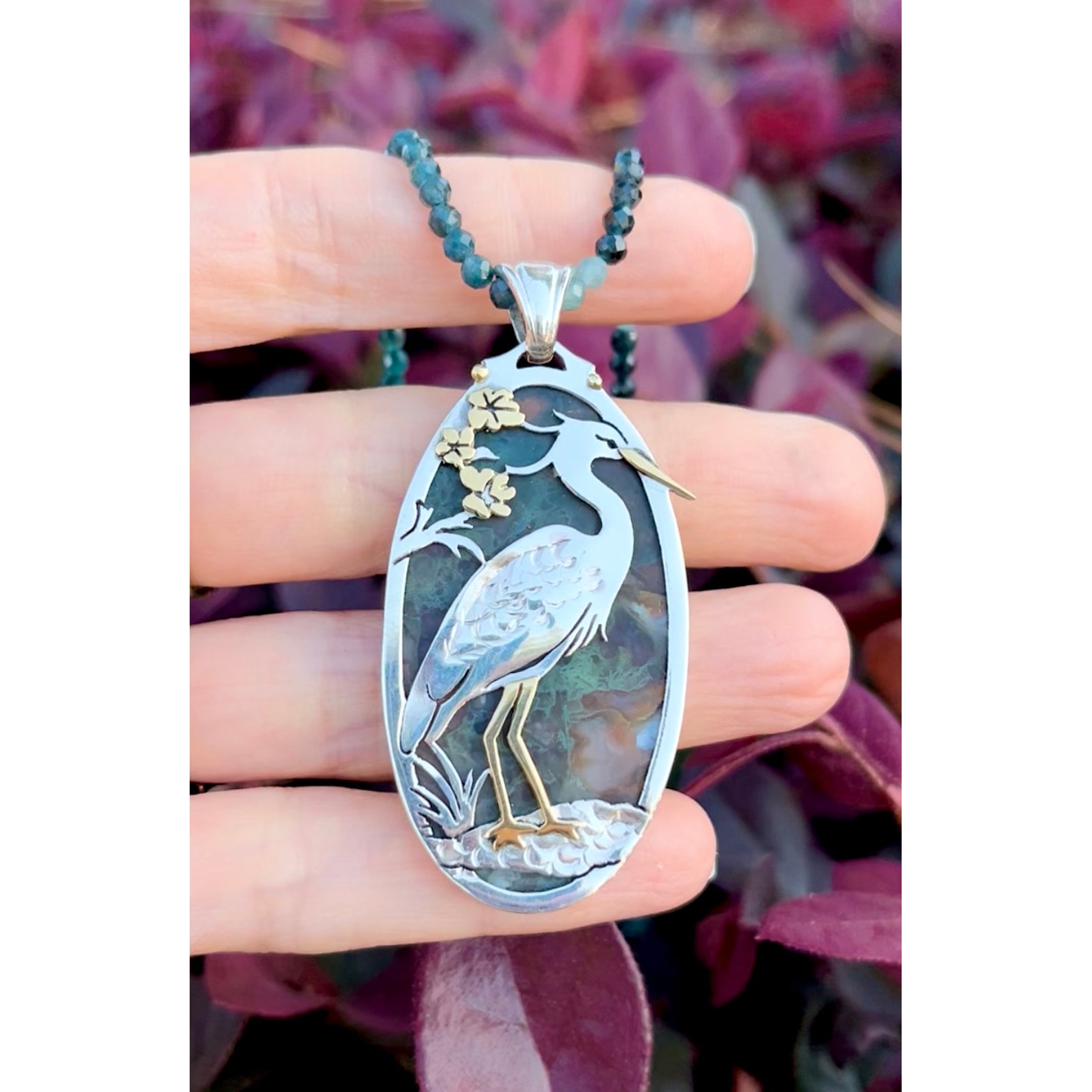 The Great Blue Heron necklace is made to order (I have a similar moss agate stone in stock).