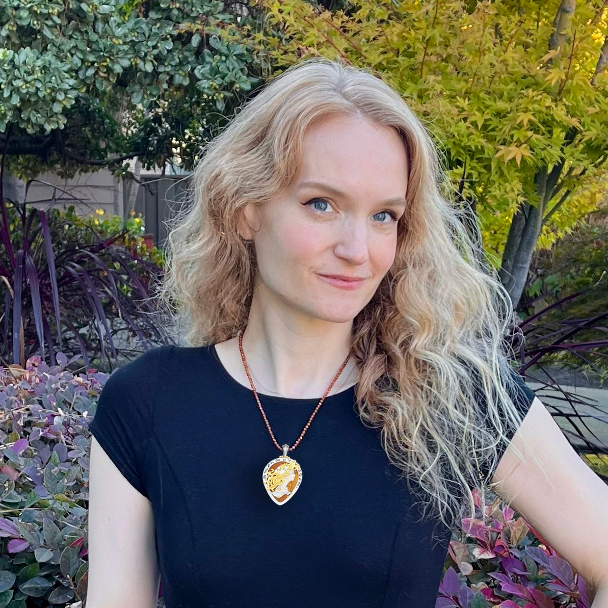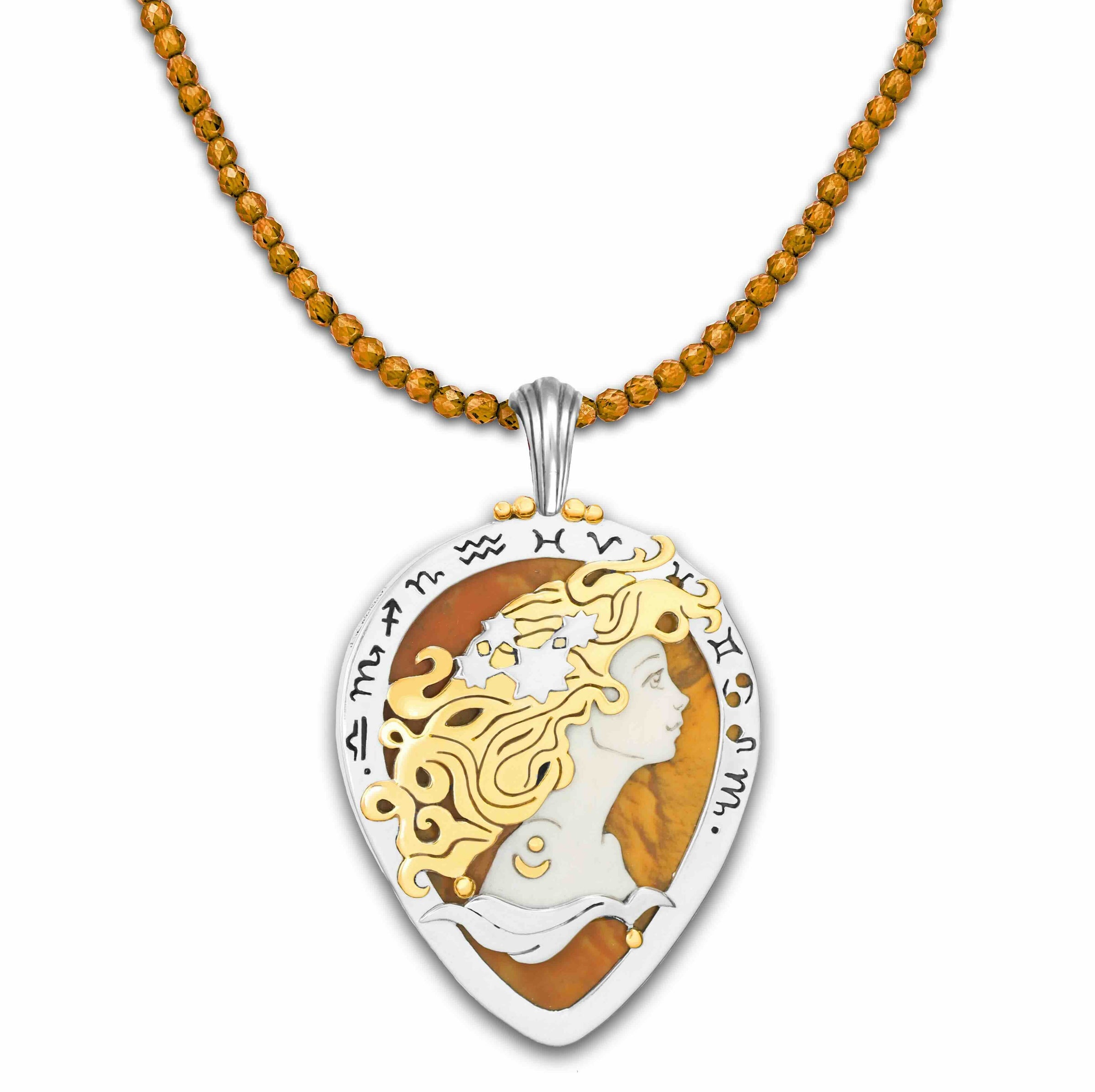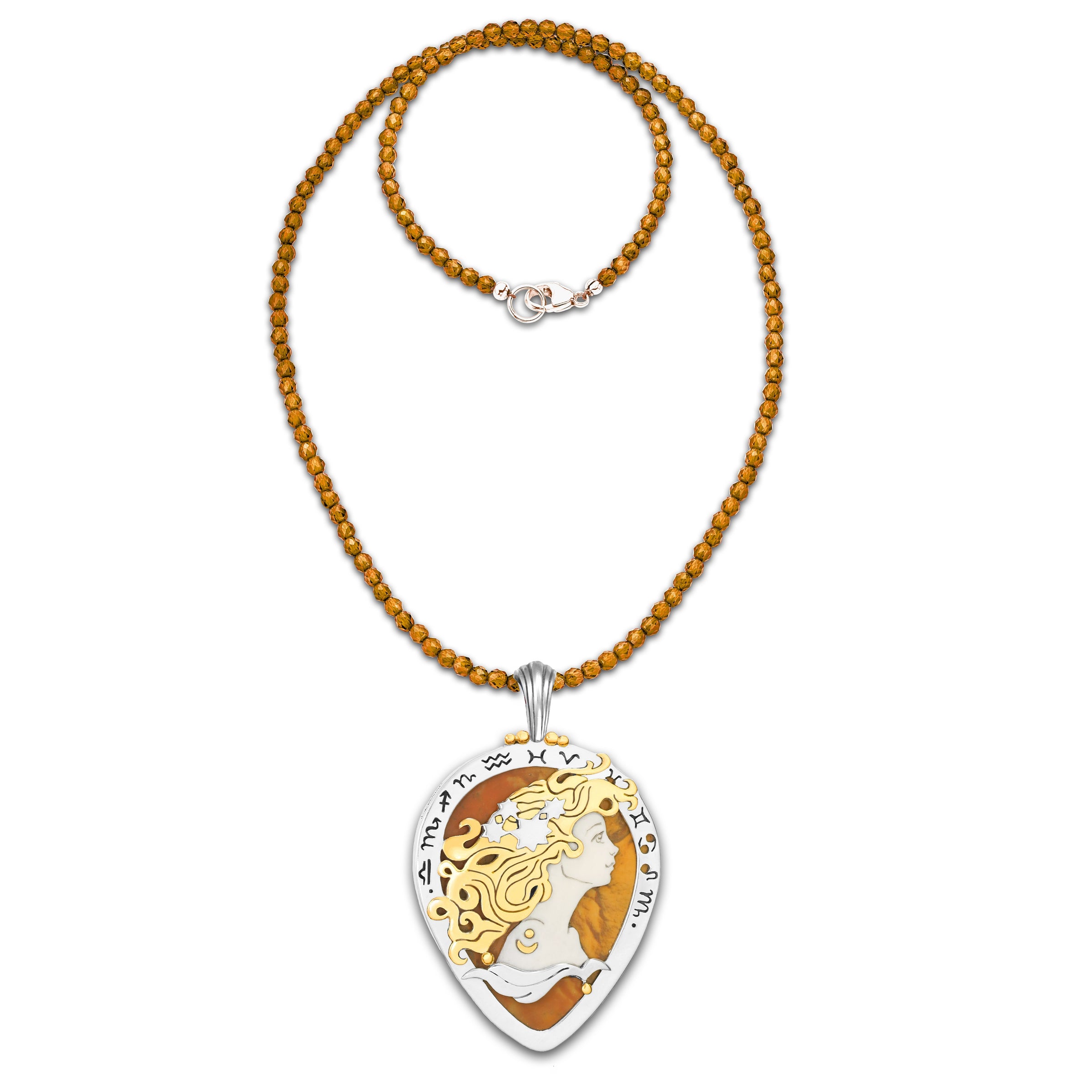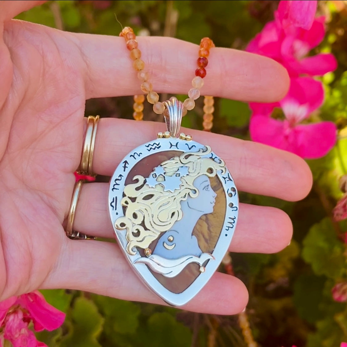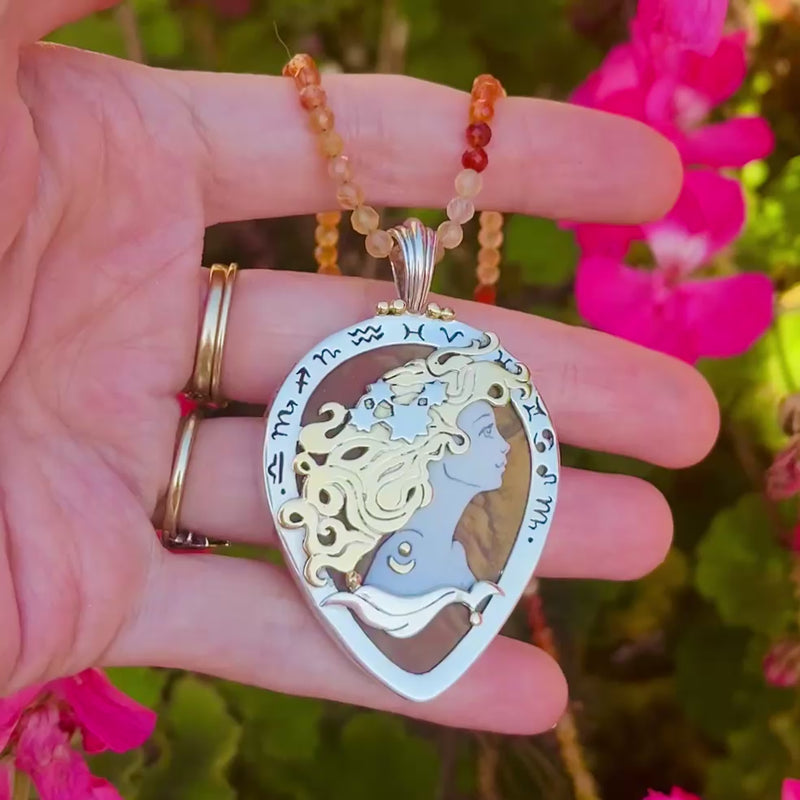 The Zodiac of the Sun represents all of the 13 astrological signs, which are intricately hand-sawn in silver around the Sun Goddess in the center. She symbolizes the sun aspect of astrology: how we present ourselves to the world and how the world sees us. She reminds us to be our authentic selves, since there is only one of us in the entire universe.