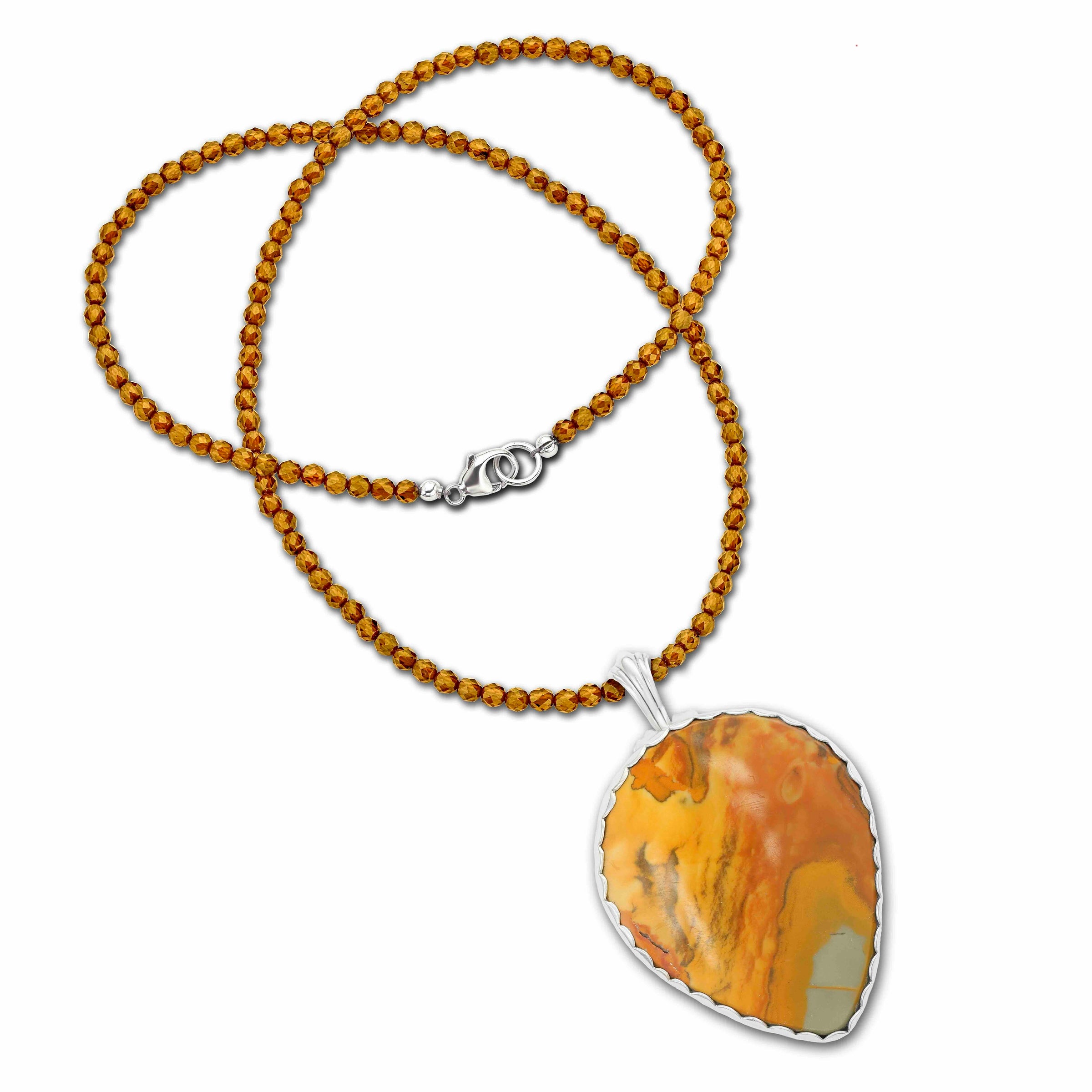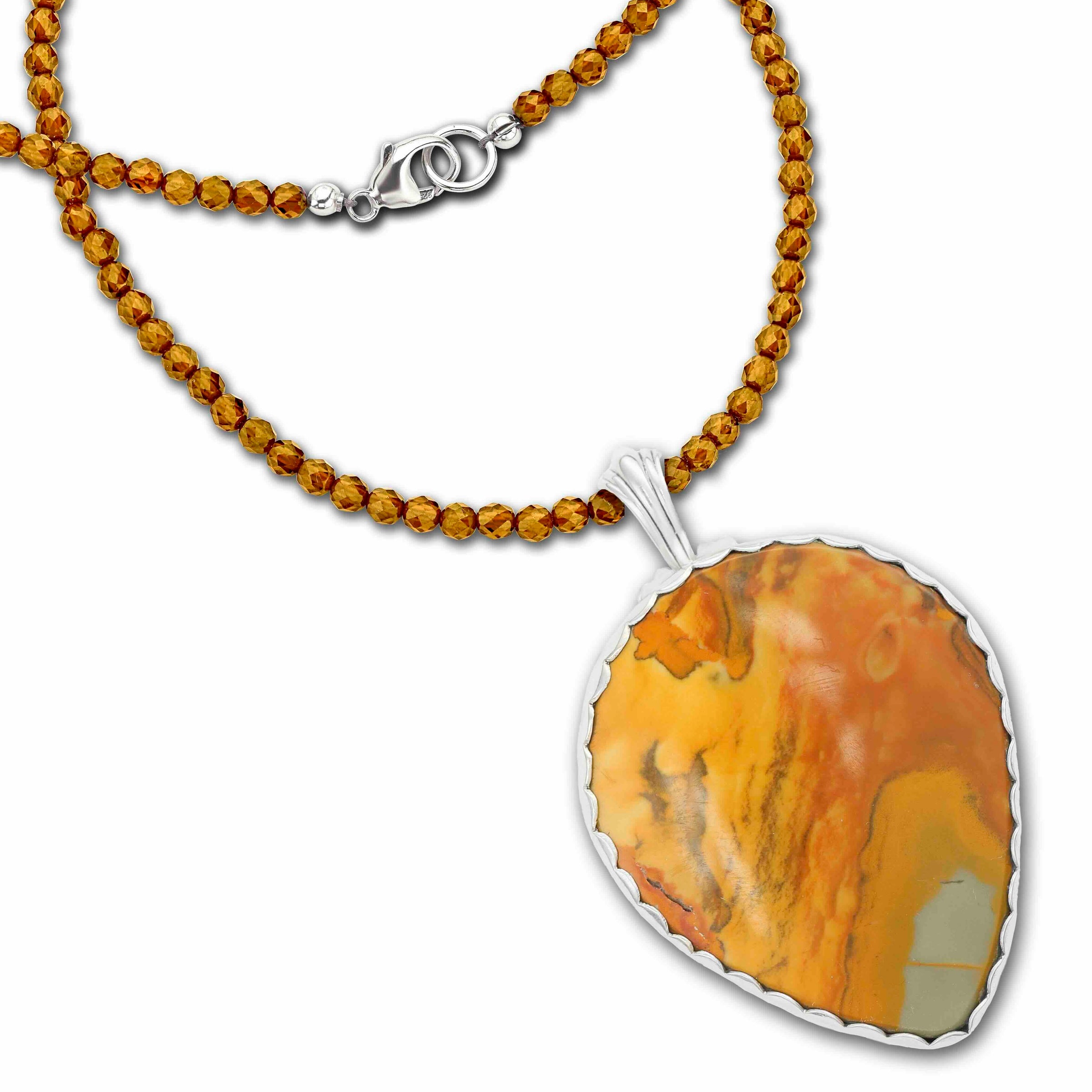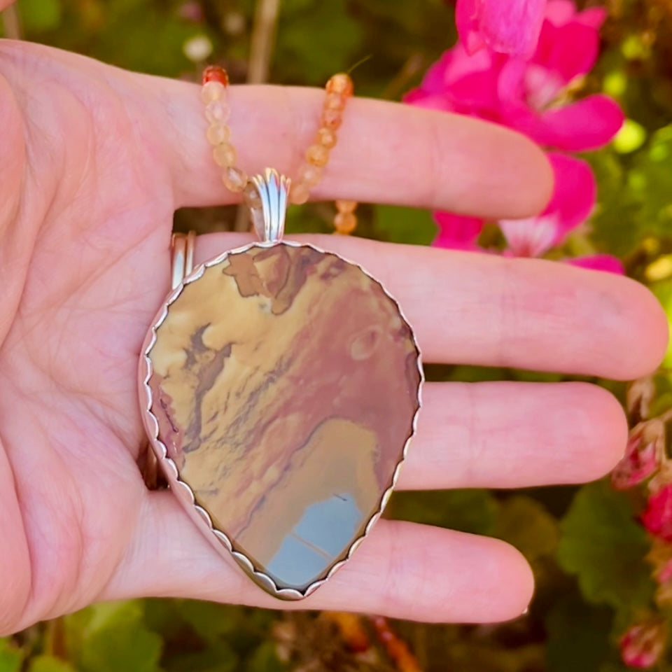 Handmade by artist Kelly Morgen from 18k gold, sterling silver, landscape jasper stone, recycled piano key, & hesonite garnet beading.