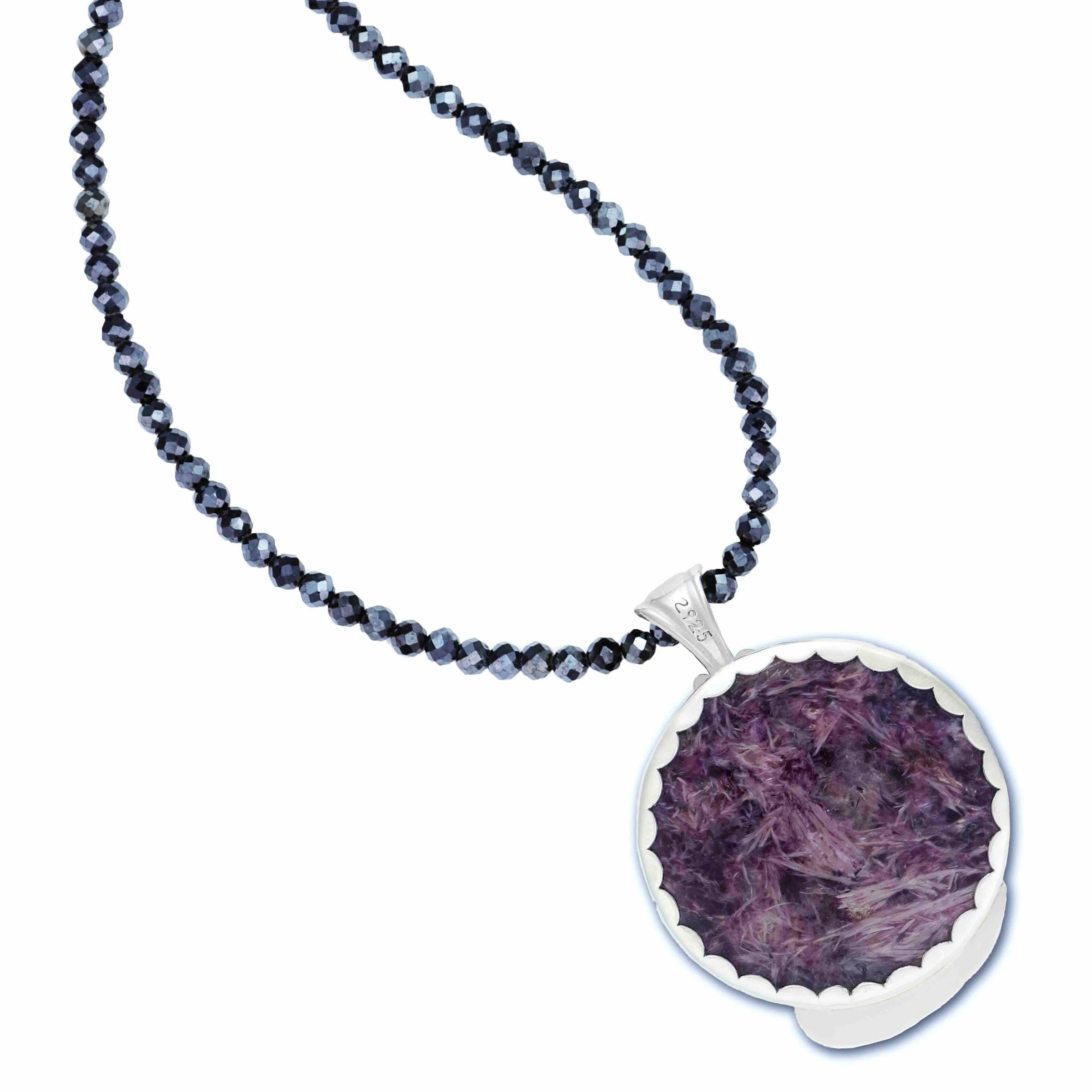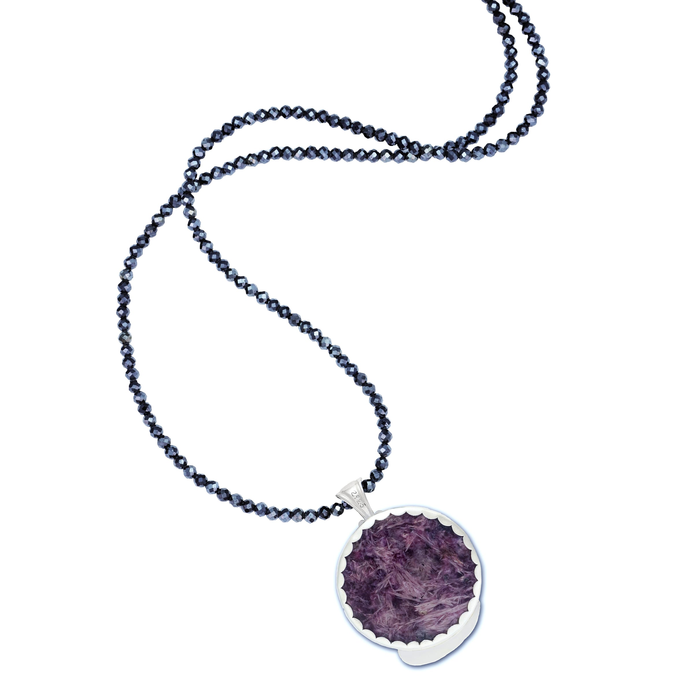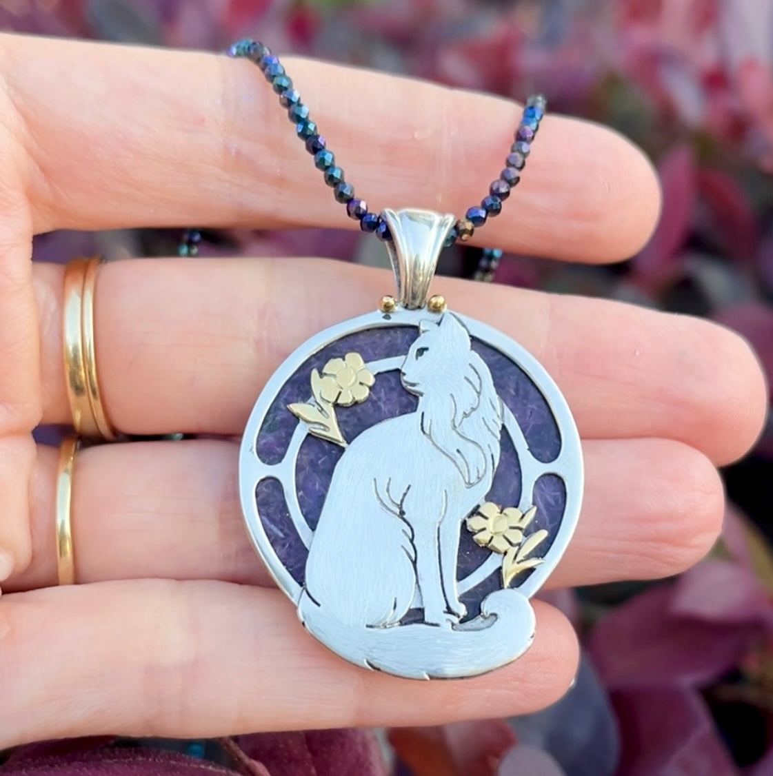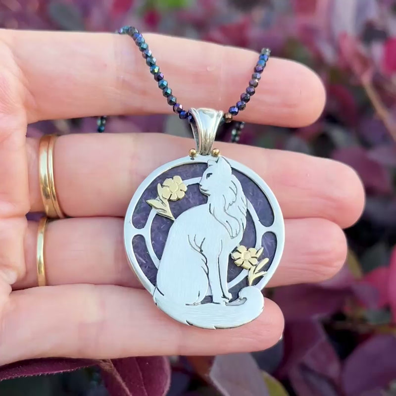Handmade by artist Kelly Morgen from 18k gold, sterling silver, purple chaorite stone, and black sapphire beading.